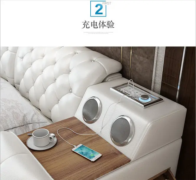 Real Genuine leather bed frame Soft Beds camas lit muebles de massage safe desk table speaker bluetooth LED light book cabinet